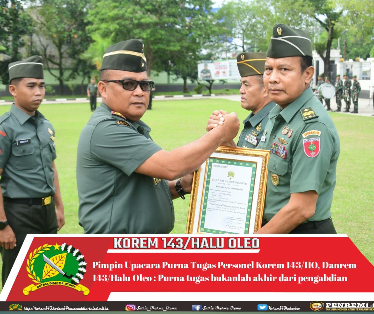 Upacara tradisi purna tugas berlangsung khidmat dan diikuti oleh Kasrem, para Kasi Kasrem, Kabalak aju dan Kabalk Rem, perwira, bintara, tamtama serta PNS Korem 143/HO. Dalam kesempatan tersebut, Danrem 143/HO memberikan penghargaan kepada personel yang memasuki masa purna tugas sebagai simbol penghormatan atas pengabdian yang telah berjasa untuk negeri .