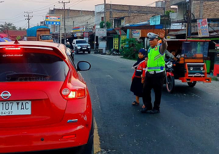 BRIPKA Aldo dan BRIPTU Asnan . Giat di fokuskan depan Masjid Jami – Al Ridha Kota Lima Puluh . Lokasi ini kerap kali mengalami kepadatan lalu lintas .
