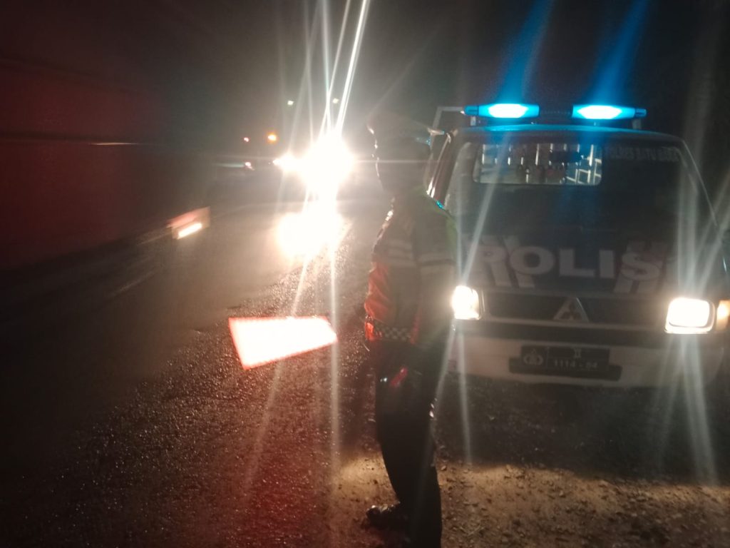 Personel Sat Lantas giat rutin melaksanakan patroli blue light di Jalinsum wilayah hukum nya , tepatnya diarea Pos Lantas Lima Puluh, antisipasi potensi kecelakaan lalu lintas dan kemacetan di malam hari .